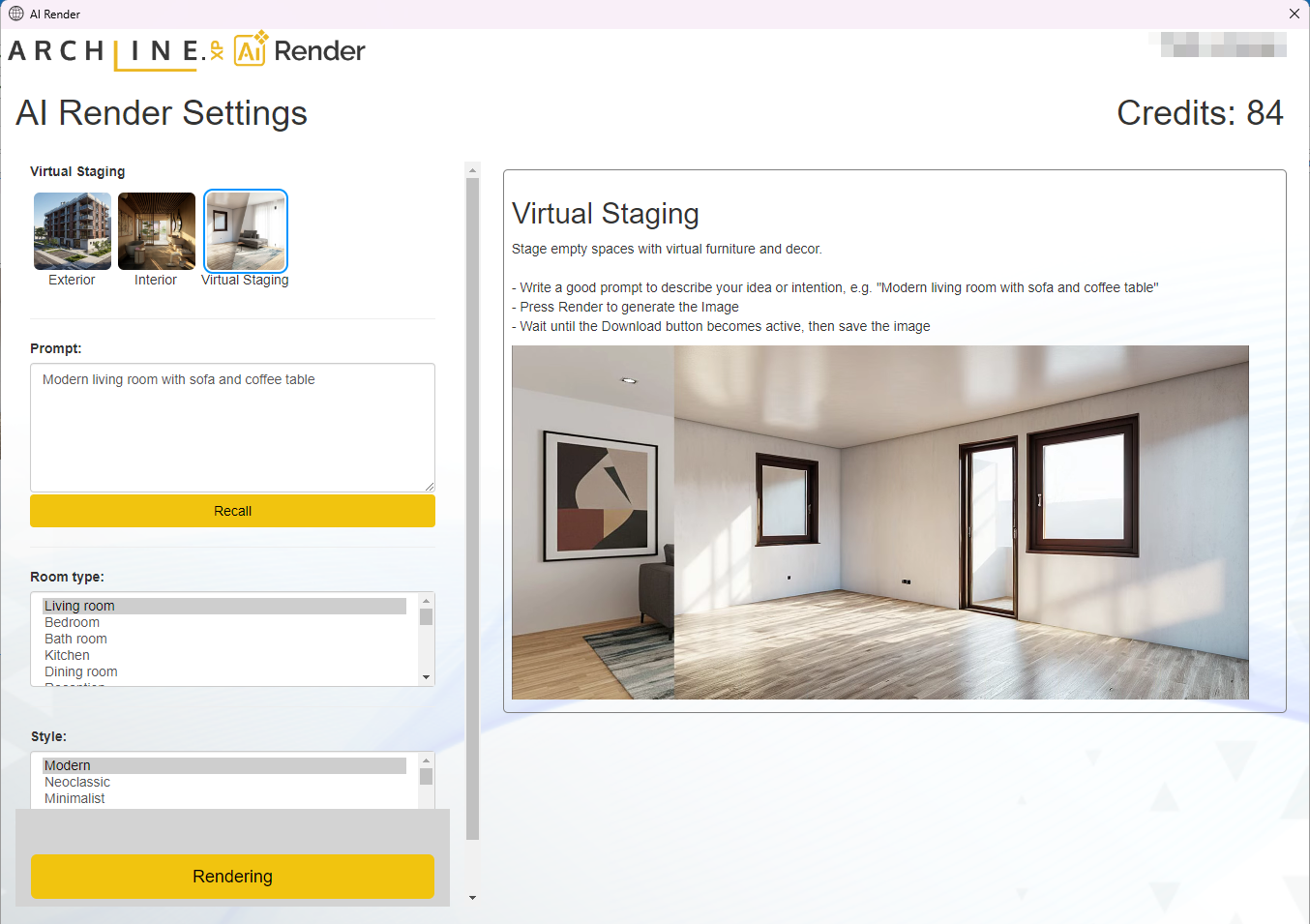 Após fazer login como usuário, acesse https://www.archlinexp.com/aicredits. Aqui você pode ver quantos créditos comprou e quantos ainda tem disponíveis. Além disso, ao executar o ARCHLine.XP, você pode ver o número de créditos utilizáveis no lado direito da caixa de diálogo do AI Render.